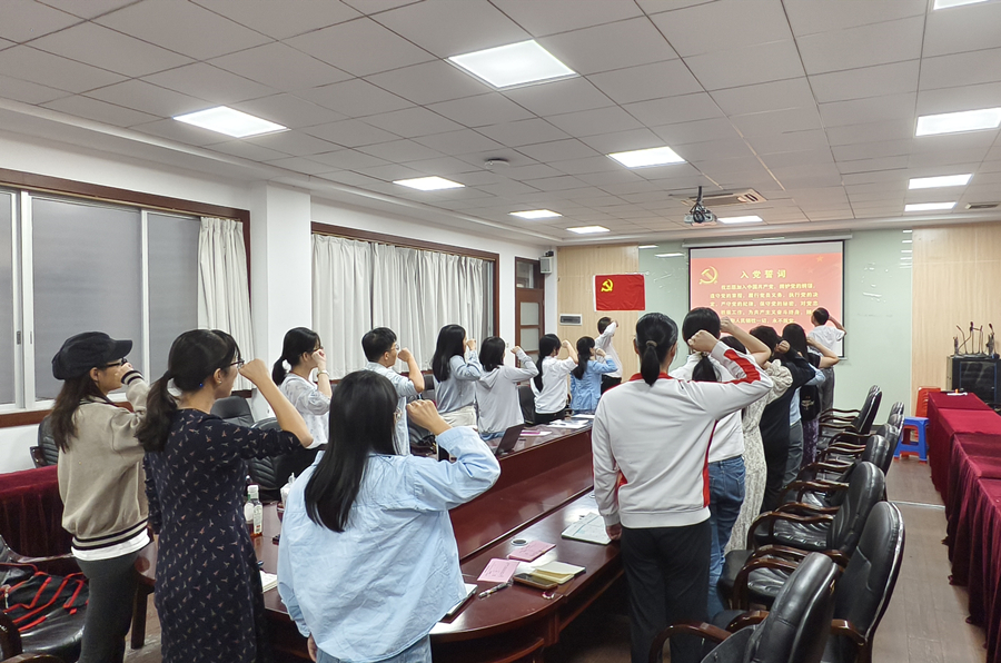 在第一议题之后,支部召开了接收甘梦秋同志为中共预备党员的党员大会。会议严格按照接收预备党员的党员大会程序进行,最后经过与会党员的无记名投票,一致同意接收甘梦秋同志为中共预备党员。支部书记唐海民同志代表党支部宣读了接收决定,正式接收甘梦秋同志为中共预备党员。介绍人张雅敏同志为甘梦秋同志佩戴了崭新的党徽。大会上全体党员重温入党誓词。