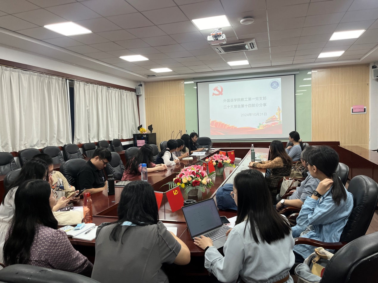 会议落实“第一议题”制度,教师党员张哲副教授作为第一议题的主讲人,主要从构建人类命运共同体的背景、内涵以及路径几个角度,分享了她对党的二十大报告第十四部分的深刻理解和感悟。此外,她也结合自己的教学实践,阐述了如何将报告精神与实践教学相结合,培养学生树立正确的世界观和人生观,引导学生正确应对社会中的复杂变化,坚守初心,砥砺前进。