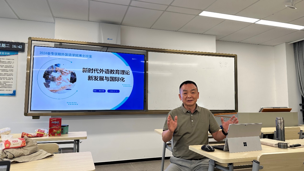 5月14日下午,必赢官网举办题为“新时代外语教育理论新发展与国际化”的博士沙龙。此次沙龙由陈刚博士主持,采用了线上线下相结合的方式,近三十位老师参加了本次沙龙研讨。