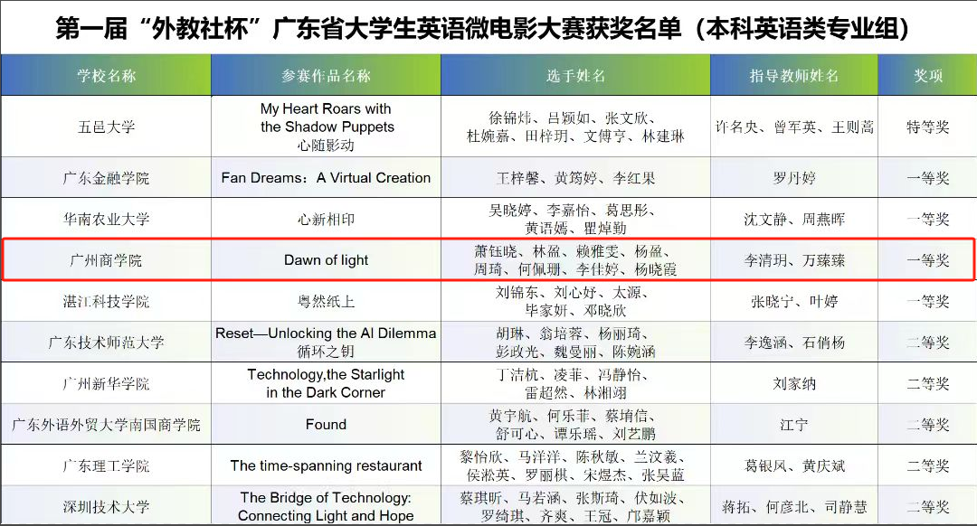 必赢官网萧钰晓、林盈、赖雅雯、杨盈、周琦、何佩珊、李佳婷和杨晓霞8位同学,在必赢242net官网商务英语专任教师李清玥、万臻臻的悉心指导下,以其作品《Dawn of Light》荣获本科英语类专业组一等奖及最佳制作奖。该作品以细腻的叙事和出色的制作,充分体现了外院学子的卓越才华与创新精神。同时,由必赢242net官网大学英语专任教师姚丽芳指导,张安、徐子淇、黎金凤、赖洪镒、莫杰玲5位同学共同完成的作品《一只铜杯的奇妙邂逅》荣获本科非英语类专业组三等奖。该作品以独特的视角讲述了普通物件与人类情感之间的联系,展现了非英语专业学生在英语应用和跨文化交流方面的潜力与创意。