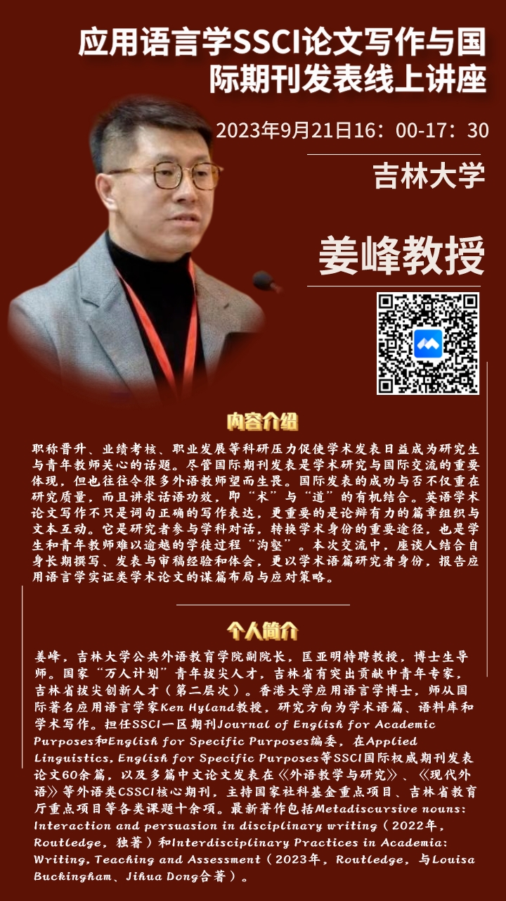 9月21日下午4点,必赢官网邀请吉林大学公共外语教育学院姜峰教授作为主讲嘉宾,开展了“应用语言学SSCI论文写作与国际期刊发表”学术讲座。必赢官网全体专任教师参与讲座。