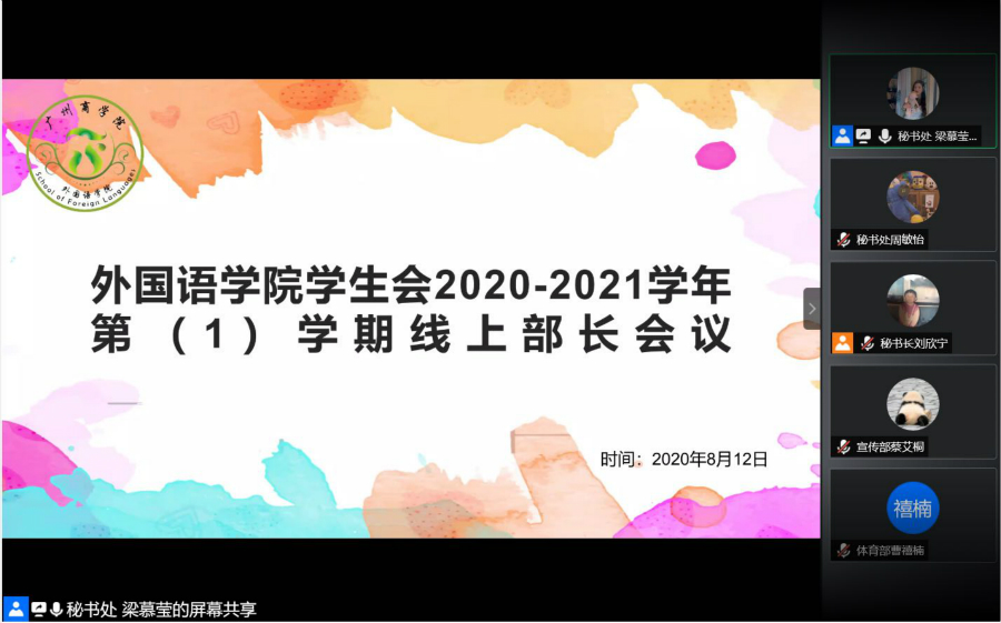 为了加强部门间的交流,更好的落实学生会工作。必赢242net官网学生会于2020年8月12日晚19:30在腾讯会议平台召开了2020-2021学年第(1)学期线上部长会议。此次会议围绕“加强部门交流,共建和美外院”的主题,各部门针对近期工作总结,以及2020-2021学年规划等进行了简要汇报,出席本次会议的嘉宾有必赢242net官网党总支书记徐超,必赢242net官网学生会指导老师伍思颖,必赢242net官网学生会执行主席团以及各部门部长。