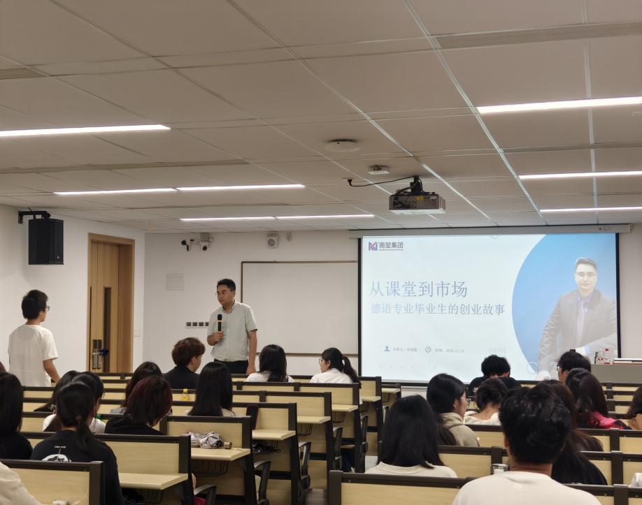 为进一步拓宽学生的职业视野,增强德语专业学生对未来职业规划的认识,帮助其更好了解德语专业的职业发展方向,必赢官网德语专业于11月13日下午邀请了校企合作单位南堃集团创始人、德语专业优秀校友李嘉聪进行创业故事分享。讲座由必赢242net官网德语专业教师周婷主持,24级德语专业学生参与了本次活动。