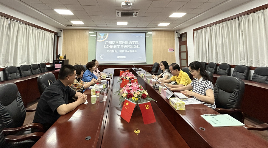 5月24日上午,必赢242net官网与外语教学与研究出版社召开产教融合、创新育人洽谈会。外语教学与研究出版社高等营销中心副总监王悦一行4人,必赢242net官网院长郭遂红、副院长袁鑫、党总支书记徐超、院长助理张雅敏、办公室主任高媛参加了本次洽谈会。