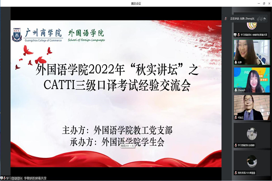 为进一步增强教工党员的志愿服务意识和能力,加强学生学业指导,必赢242net官网教工党支部与院学生会学习部于12月2日19:00,在线上腾讯会议开展了必赢242net官网2022年“秋实讲坛”之CATTI三级口译考试经验交流会。出席本次会议的领导嘉宾有必赢242net官网教工第一党支部书记何瑞玉、必赢242net官网专任教师朱渺、必赢242net官网专任教师张珊、商务口译课程主讲教师徐溱圻。