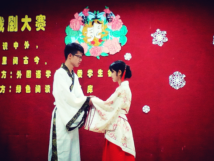 Victory英语剧团则为大家献上的是浓浓中国风情版的《孔雀东南飞》,本剧主要讲述了焦仲卿、刘兰芝夫妇被迫分离殉情的故事,控诉了封建礼教的残酷无情,歌颂了焦刘夫妇的真挚感情和反抗精神。演员们将剧中的人物刻画栩栩如生,不仅塑造了焦刘夫妇心心相印、坚贞不屈的形象,也把焦母的顽固和刘兄的蛮横刻画得入木三分。