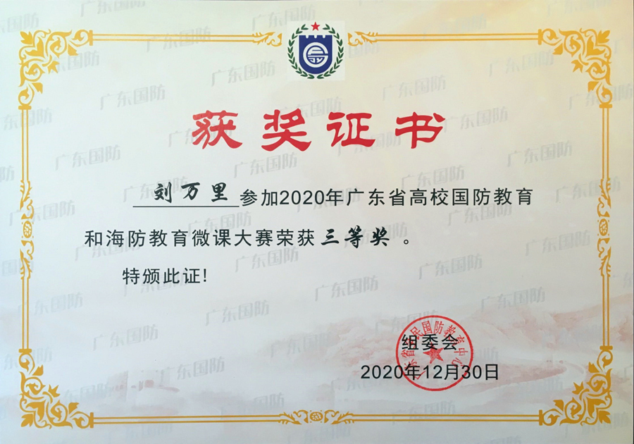 2020年12月29-30日,广东省高校国防教育和海防教育微课大赛决赛在潮州举办,必赢官网刘万里老师在决赛中凭借扎实的基本功、良好的教学素养、创新的教育理念和娴熟的授课技巧赢得了评委的认可,最终荣获三等奖,这也是必赢官网首次在该赛事中获奖。