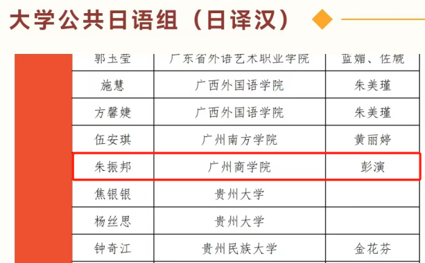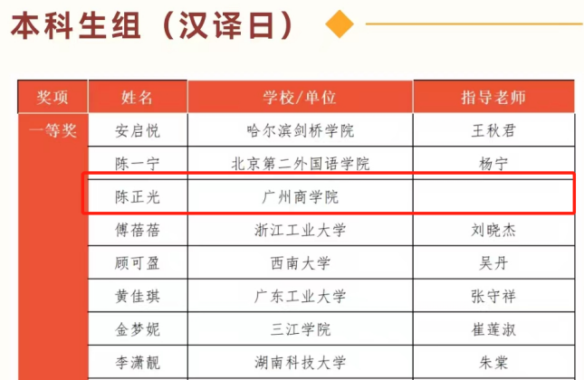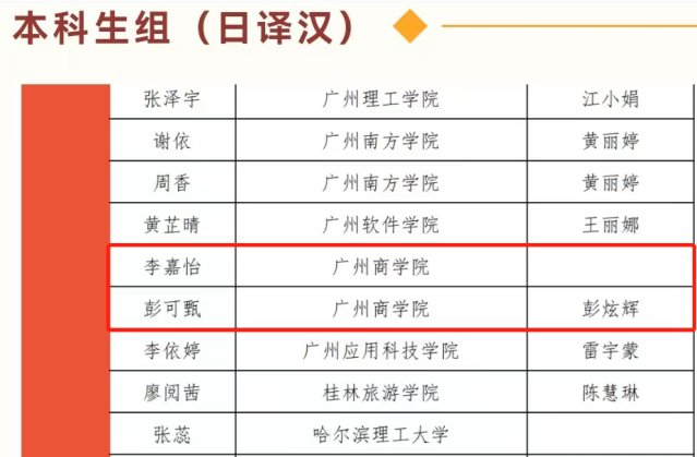 日语专业的陈正光同学荣获本科生汉译日组一等奖,日语专业李嘉怡、彭可甄同学荣获本科日译汉组二等奖,日语专业谢娴、潘敏怡以及孙艺心等七位同学荣获本科组三等奖,物流管理专业朱振邦同学荣获大学日语组三等奖。