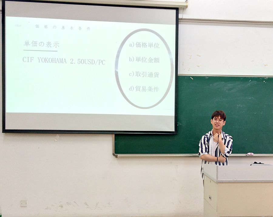 本次研讨课主讲老师为彭炫辉老师,课程主讲内容为第三章“价格条件”。课程开始,彭老师先回顾了上一次课关于合约条件的内容,并以此引入本次课程的主题。彭老师向学生介绍了价格的概念以及用于交易的货币类型,并结合目前国际上最新的贸易条款、贸易术语以及交易案例,对贸易条件、交易双方的责任划分以及交易类型的异同进行深入的讲解,引导学生深入了解在交易过程中的商务习惯和注意的事项。最后,组织学生进行课堂练习,复习刚才的知识点。课堂上,彭老师全程用日语授课,除了讲授课本相关知识以外,还增加了许多的课外延伸拓展的知识,遇到重点内容会适时给学生进行讲解和强调。