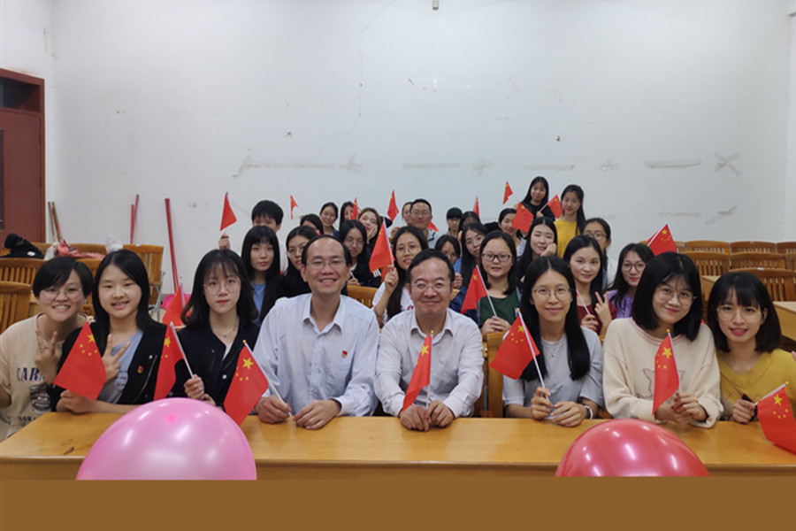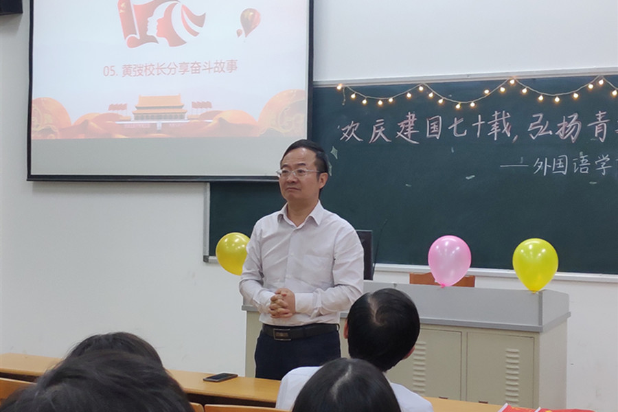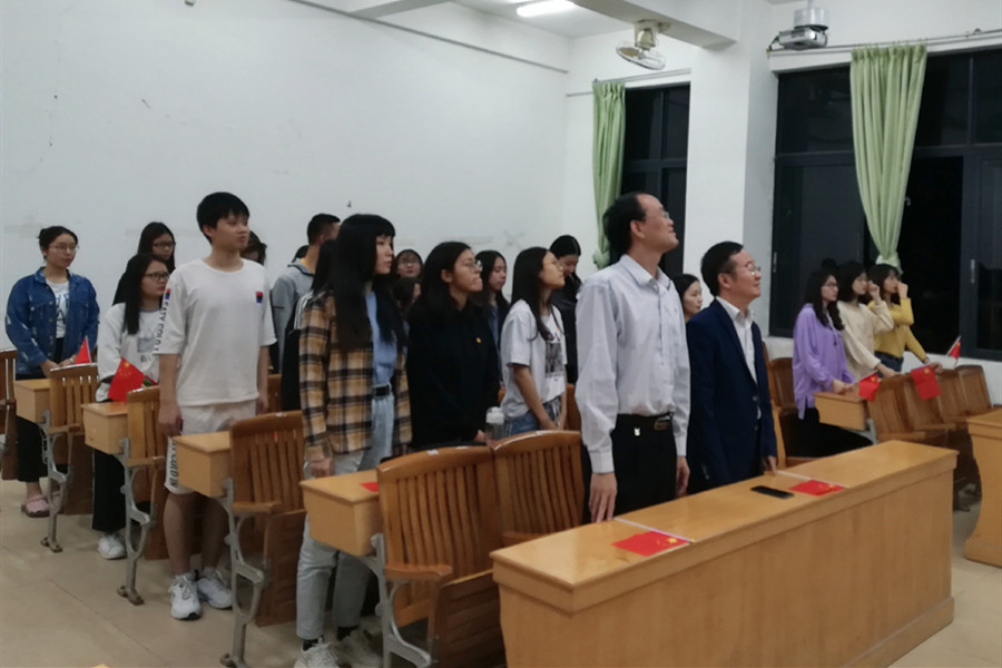 为庆祝中华人民共和国成立70周年,弘扬当代青年爱国精神,树立报国之志,推进“不忘初心、牢记使命”主题教育工作,必赢官网17级英语2团支部于11月14日晚在四教111开展了以“欢庆建国七十载,弘扬青年爱国志”为主题的团日活动。班级结对子老师黄弢校长、学院党总支徐超书记、辅导员郑灿玲老师出席活动,班会由团支书林晓莉主持。