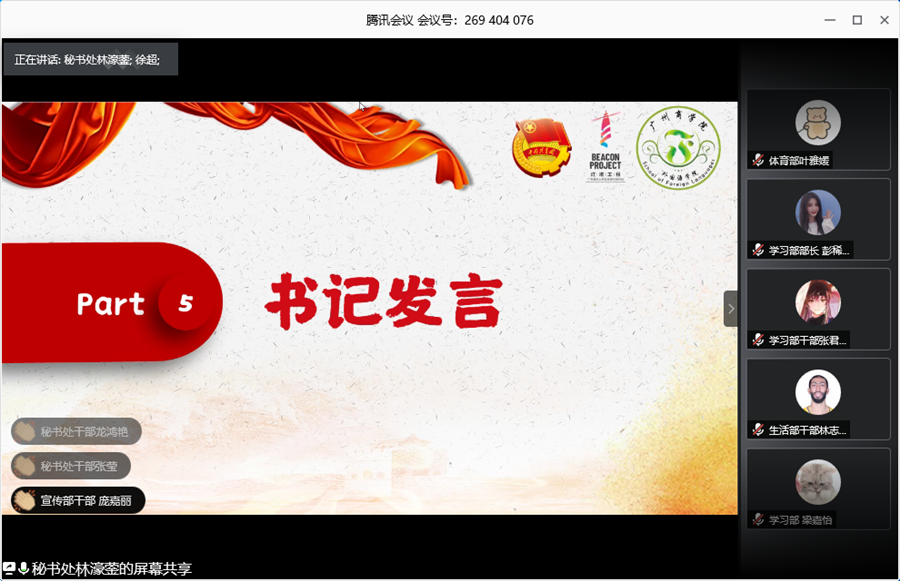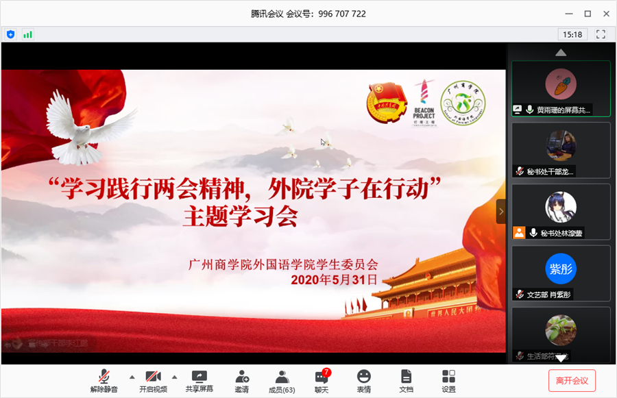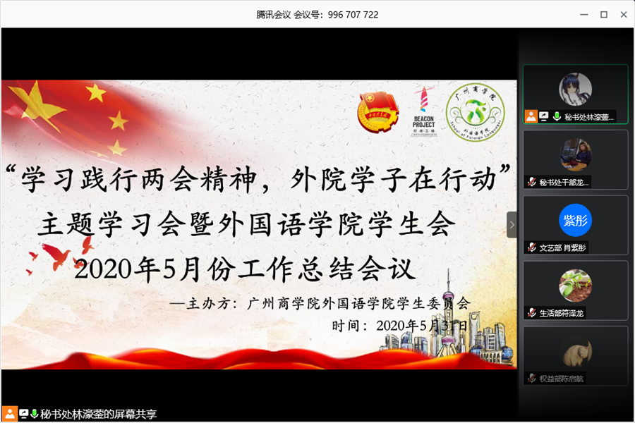 为深入学习宣传贯彻全国两会精神,引导必赢官网学生干部深刻领会两会的核心要义,同时展现必赢官网学生干部不忘初心做好本职工作的精神面貌,确保学生工作的有序开展,必赢官网学生会于5月31日15:00在腾讯会议平台上举行以“学习践行两会精神,外院学子在行动”为主题的学习会暨5月工作总结会议,出席本次会议的有学院党总支书记徐超,学院学生会指导老师伍思颖以及学院学生会全体干部。