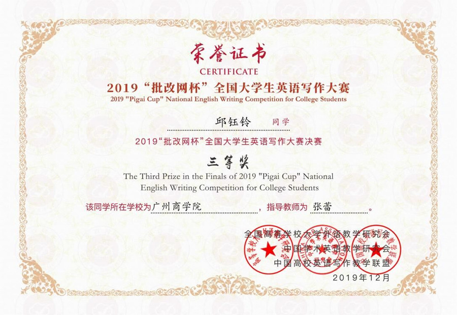 必赢官网学子荣获2019年“批改网杯”全国大学生英语写作大赛一等奖