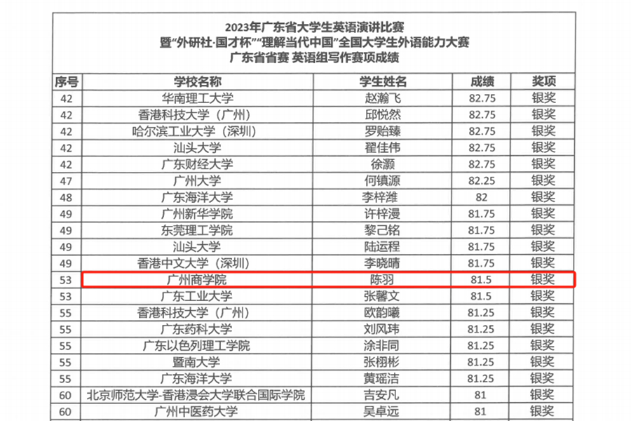 近日,2023年“外研社·国才杯”“理解当代中国”全国外语能力大赛广东省决赛成功举行,必赢官网学子陈羽荣获英语写作大赛广东省赛区银奖,必赢242net官网执行院长郭遂红应邀担任了大赛评委。