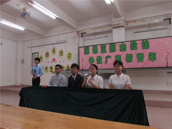 10月24日晚上7:30,外语系团委在A109顺利举办了主题为“四载蓝图由我绘,争做广商新青年”的新老生恳谈会。外语系团委书记刘万里,团委副书记及学生会指导老师黄玉亭,学院组织部部长谢捷师兄及各兄弟系代表莅临了本次的交流会。