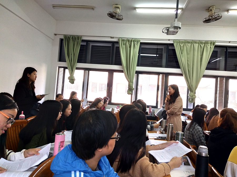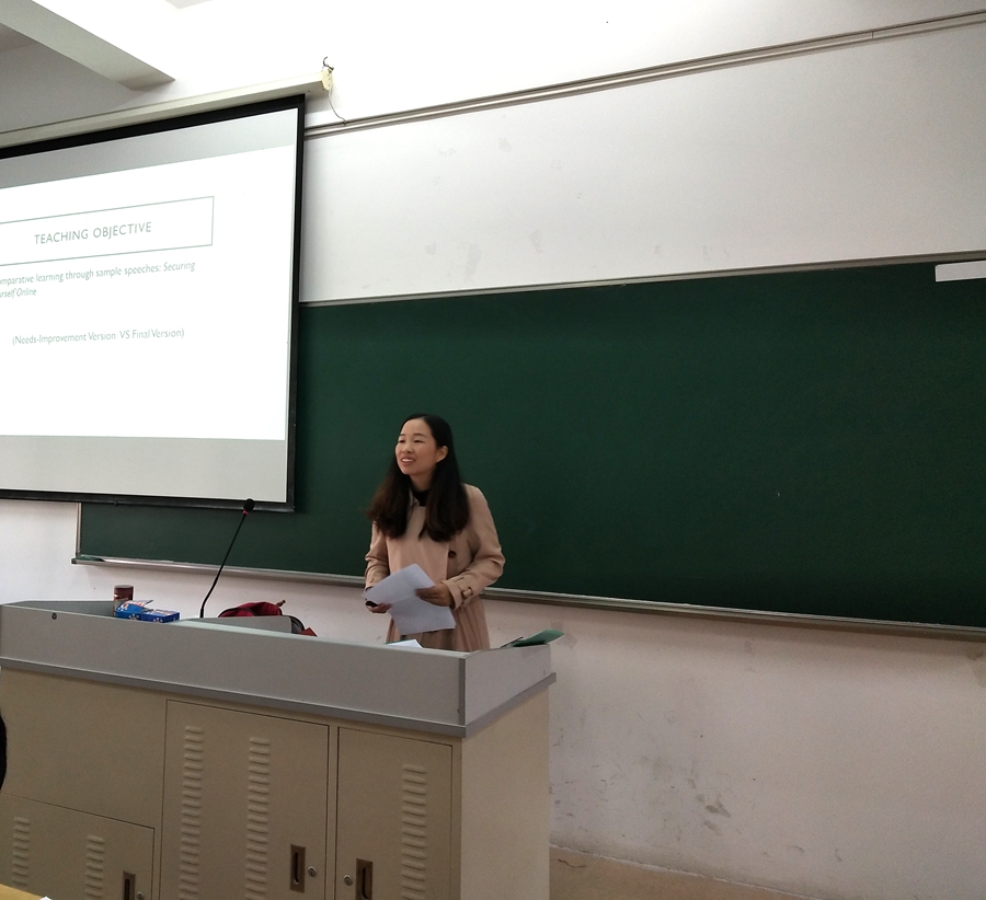 本次研讨课的课程为《英语公共演讲》,主讲老师是邵春发老师。课程开始时,邵老师先对上周的知识点进行了回顾及介绍本次课程的学习要点。接着对本次课堂需要讨论的两篇演讲稿进行讨论和分析,师生进行互动。邵老师运用对比教学的方式,将课程的要点和技巧渗透在课堂中,引导学生自主学习,是本次研讨课的亮点。且邵老师全程用英语教学,教态自然,语调平稳,发音清晰准确,整个课堂课程安排流畅,设置合理、指引明确、思路清晰、步骤衔接、组织良好,展示出较高的教学水准,全场气氛活跃,学生参与度高,知识接收效果良好,得到了在场老师们的一致好评。