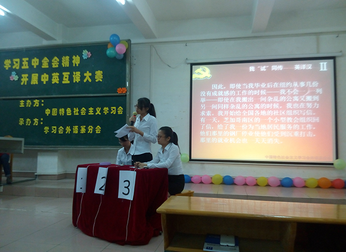 2015年11月20日星期五晚,中国特色社会主义学习会外语系分会于教学楼A107举行了以学习五中全会精神为主题的中英互译大赛决赛,出席本次决赛的有外语系党总支徐超书记,评委李卓华老师,校学习会副理事长黄晓玲,翻译协会会长张庆卫、副会长李嘉欣以及学习会外语系分会的全体干部。詹淑芝、梁志健分别担任中英文主持。