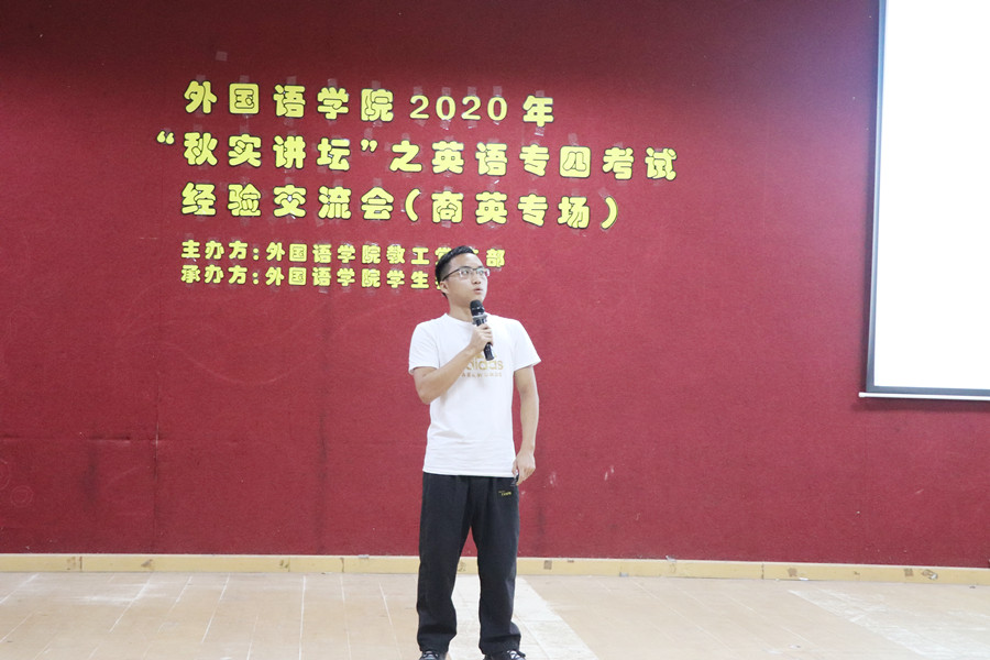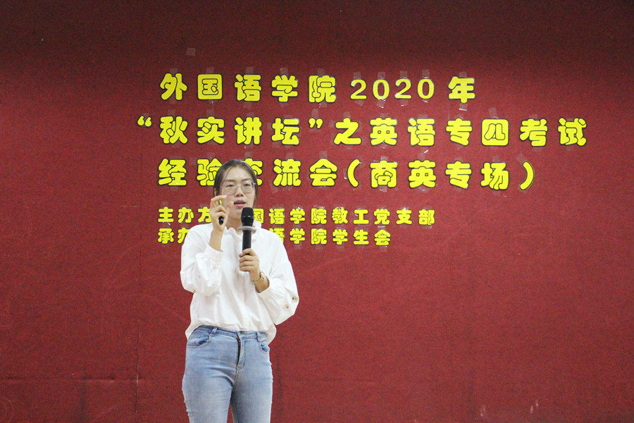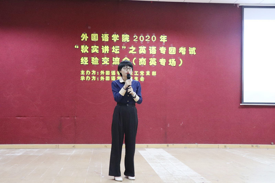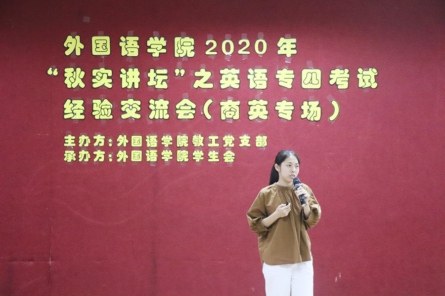 为进一步发挥基层党组织的战斗堡垒作用,发挥师生党员的先锋模范作用,帮助学生更好地备考英语专业四级考试, 2020年11月20日下午4点20分,必赢官网教工第一党支部联合必赢官网学生会在一教206隆重举办了2020年“秋实讲坛”之英语专业四级经验交流会(商英专场)。必赢官网教工第一党支部书记李海燕老师、19级辅导员谢清玲老师、学生嘉宾路晓莉和邱茂山以及各年级同学参加本次交流会。