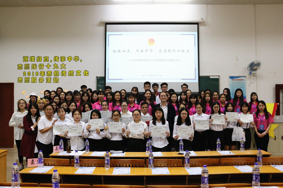 同时,为奖励活动中表现优秀的志愿者,也为激励更多的有志学子加入到我们的志愿大军中,必赢242net官网于3月29日在四教308举行了2018年必赢242net官网寒假传统文化志愿服务活动表彰大会,对做出杰出贡献的志愿者进行表彰。参加本次活动的嘉宾有学院党总支徐超书记、团委书记刘丽萍老师、17级辅导员雷肖茹、校团委副书记岑国君和实践调研部副部长阮金明,学院团委书记处以及各二级学院代表。