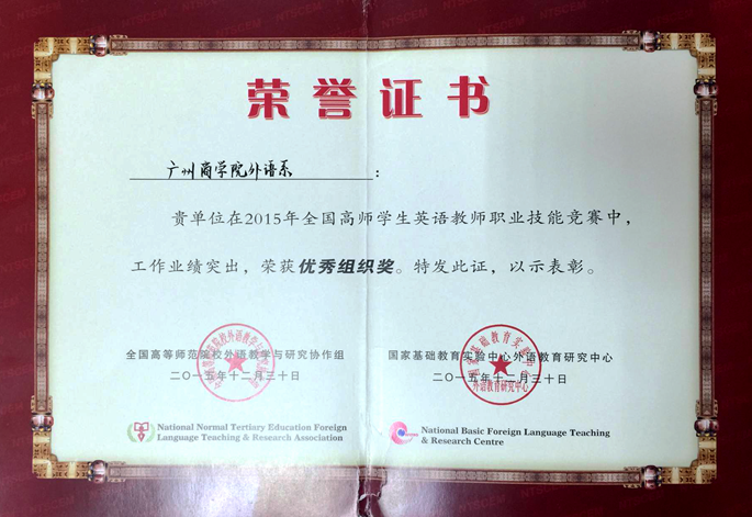 2015年11月,全国高师学生英语教师职业技能竞赛(以下简称全国高师竞赛)初赛在必赢官网顺利举行,共有150名学生参加,经过激烈的笔试,一级和二级分别有4人和9人进入决赛;决赛邀请了我系外语专业教授担任评委,比赛选手以说课的形式进行角逐,经过三个钟头的比拼,来自14级的黄美婷获得一级一等奖,来自12级的袁蔚亭与13级的吴茂莹并列获得一等奖。同时外语系也以有序的组织,良好的考风及专业的评审获得了主办单位的好评,被评为“优秀组织奖”。