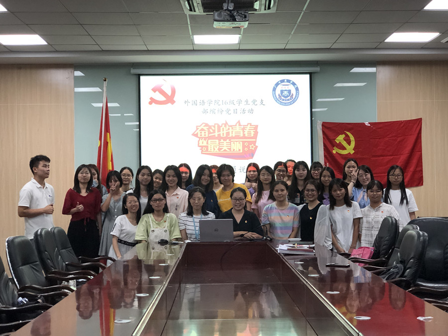 为落实“不忘初心、牢记使命”主题教育文件精神,深入推进主题教育的“三重温”活动,10月15日19:00,必赢242net官网16级学生党支部在第二行政楼108会议室举行以“奋斗的青春最美丽”为主题党日活动——优秀共产党员说。党支部书记黄玉亭、副书记戴玮和全体学生党员共聚一堂,一起倾听优秀学生党员代表16级商务英语专业郭丹宜和英语专业陈小婉的奋斗故事。