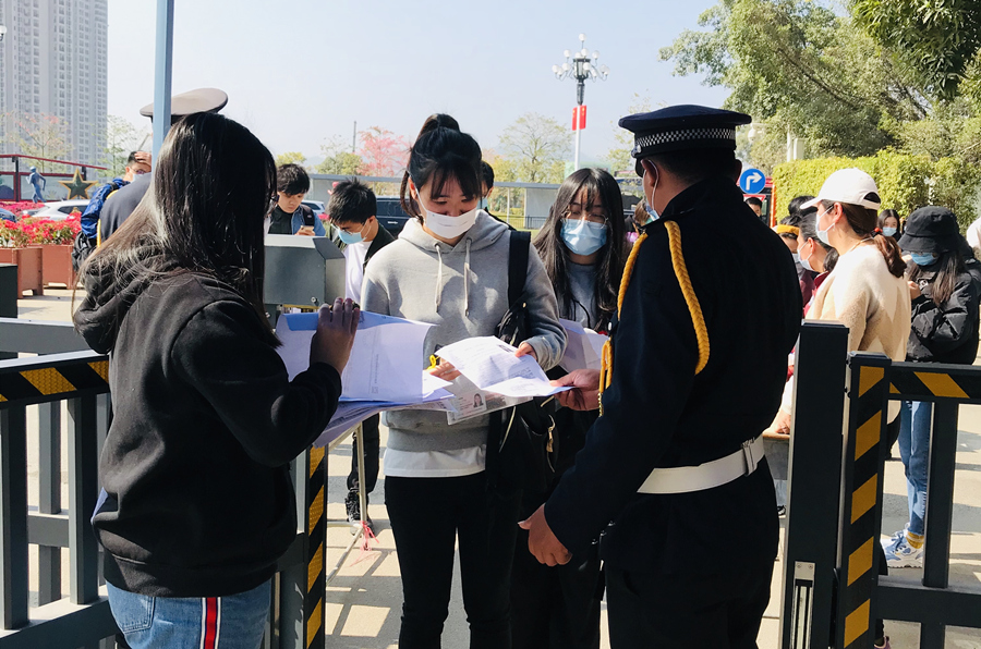 12月6日11点,校外考生开始进校。学生必须提供相关证件和健康码,经过安检和体温检测合格后方能进入校园;抵达考场后还接受了安保人员和监考老师的双重安检及身份确认。下午13点30分考试正式开始,在考试中,监考老师严格按照要求,开启信号屏蔽器,查处各类违禁品,保证考试的公平公正;同时考场设置大时钟、协助考生寻找座位、洗手间陪同、细语提醒等环节也体现了监考老师良好的人文关怀。同时为进一步做好考生考后的服务工作,考务人员还在第四教学楼左侧设置邮寄信息登记点,专门为有需要的考生提供成绩单和证书的邮寄服务,很好地体现了“以生为本”的工作原则。学校和必赢官网领导高度重视考试,由学校主考、副主考和巡考对各考场不间断巡查,及时解决出现的各种问题,保证了考试的顺利进行。