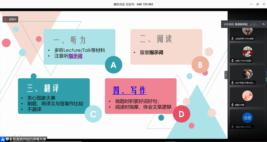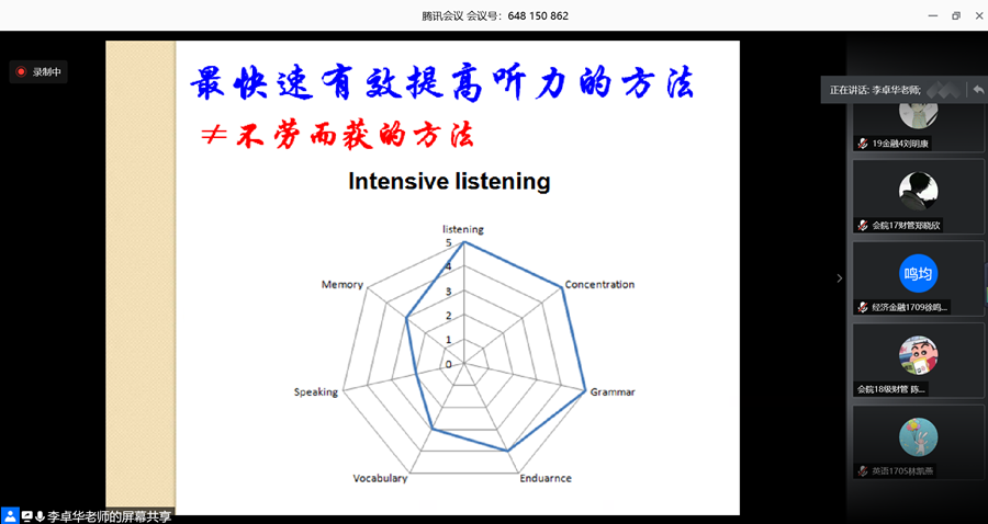 为进一步推进基层党建工作水平提升, 实现基层党组织的党建工作与学校人才培养有机结合,2020年7月14日晚上,必赢242net官网教工第二教工党支部与校学生会通过“腾讯会议”平台联合举办了“春华讲坛”之大学英语六级考试师生经验交流会。必赢242net官网第二党支部教工党员李卓华老师担任主讲教师,必赢242net官网的甄嘉颖同学担任学生嘉宾。学生们通过“腾讯会议”平台参加讲座,打破了受疫情影响造成的空间限制。