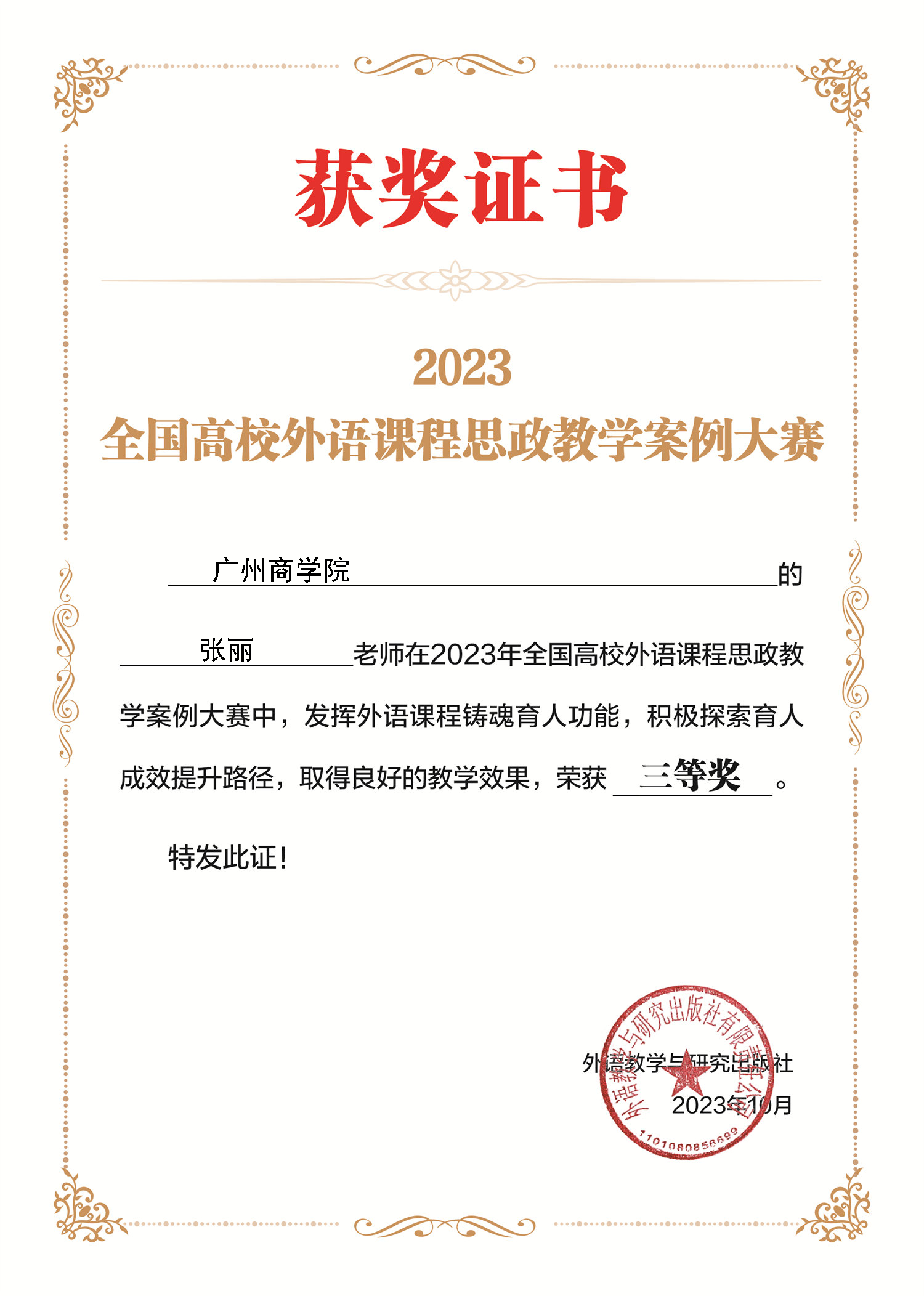 张丽获奖证书
