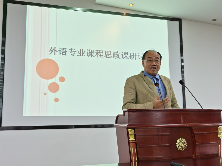 接下来,袁鑫副院长带领全院教师仔细研读《高等学校课程思政建设指导纲要》,结合《纲要》的精神和核心内容和《外国语语言文学专业国家教学质量标准》,系统回答“什么是课程思政”、“什么是外语专业课程思政”,以及“如何教课程思政”三个基本问题。他指出课程思政的核心是“价值观教育”,习近平主席的隐喻“把盐放入汤里”就要求课程思政融入教学需要“融入点”和“提升点”。然后,他把《纲要》中提出的课程思政内容总结为国家、社会和公民三个层次的“家国情怀”,涵盖了把社会主义核心价值观,政治认同、文化素养、法制意识和道德修养,这与外语专业的《国标》提出的“中国情怀”是相同的,也是外语专业课程思政的“融入点”,而《国标》提出的“国际视野”也是外语专业进行课程思政的切入点和特色点。他重点分析了北京外国语大学孙有中教授提出的“外语专业的课程思政就是培养跨文化能力”的观点,指出“人类命运共同体”的价值引领就是外语专业课程思政的“提升点”,外语专业课程思政就是帮助学生能在语言学习中“见社会、见国家、见世界、见自己”,用外语讲好中国故事,使教育更富格局。最后他从途径、方法和策略三个层面分享了如何在专业教学中进行课程思政。