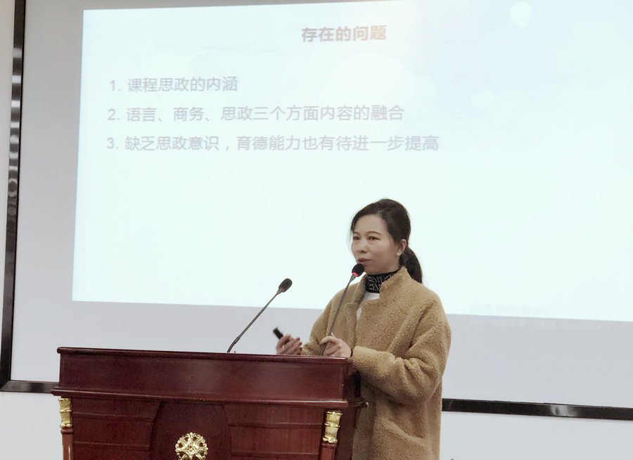 会议的第一个环节是由程瑜瑜、张雅敏、李晶、李望华、周昳旸五位老师向全体教师分享开展课程思政的经验。程瑜瑜老师介绍如何在《中国文化概论》教学过程中将 value扩展为:Civility、Harmony、Equality、Friendship and a Community of Common Destiny,并通过价值引导将思政教学设计和教学目标相结合;张雅敏老师在课堂上通过认知性问题、分析性问题、评价性问题、思辨性问题引入思政点,引导学生进行深入思考,提升对社会现实的认识;李晶教授通过立足于人类学的研究方法,通过跨文化比较,让学生明白灿烂的日本文化背后是灿烂的中国文化,日本古典文学的支撑是中国文化,从而引发学生的文化自信和民族自豪感;李望华老师在课堂导入部分引入时政实例,用批判性思维解析课文背景;周昳旸老师则是在国贸课程中,通过贸易规则和文化引入诚信、法治等理念,从而实现课程思政的教学目标。