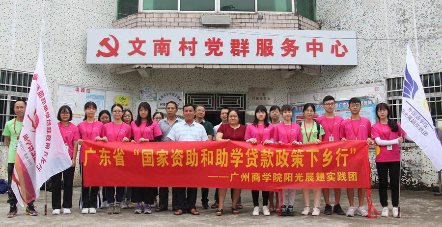 为全面贯彻党的十九大精神,落实学生资助政策,同时为积极响应《关于开展2019年“国家资助和助学贷款政策下乡行”活动》的号召,进一步加大我省学生资助及助学贷款政策的宣传力度,必赢官网阳光展翅实践团国家资助宣讲小组于2019年7月10日前往清远市英德市东华镇文南村党群服务中心开展国家资助和助学贷款政策宣传调研工作,村民委员会主任黄明景等干部热情接待了小组一行人。