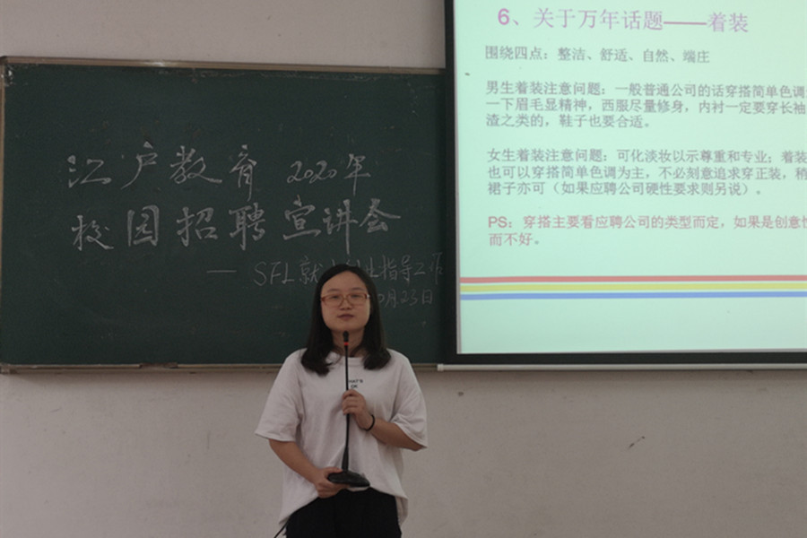 宣讲会开始后,梁雅瑜为到场的同学们讲授了就业求职中的小技巧,包括简历的信息编辑与版面设计、应聘着装的要求、与HR的有效互动方式等。期间,为了让同学们更加自信地上台展现自我,现场组织了一次自我介绍和相互介绍的模拟面试,老师们根据每位同学的表现予以点评。随后,江户教育校长安娜详细分析了当前外语教育的行业发展势态,介绍了该教育机构的成长历程、岗位需求、员工成长体系等,并为同学们解答疑问。