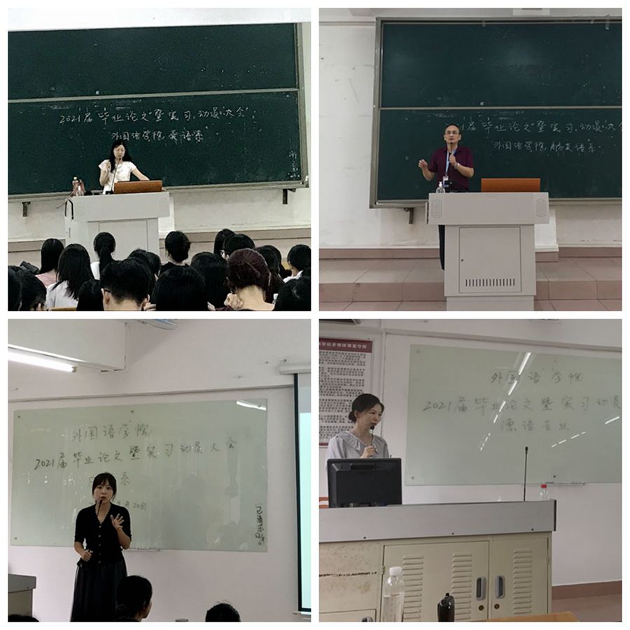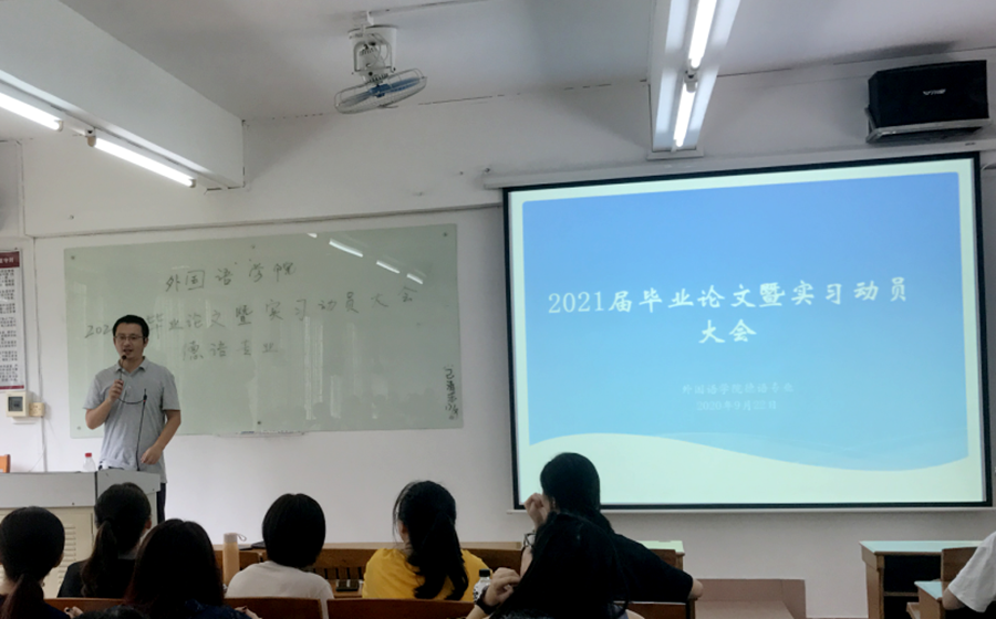 9月22日-9月24日,必赢官网先后组织了德语、商务英语、日语、英语四个专业毕业生召开了四场“2021届毕业论文暨实习动员大会”,必赢官网副院长袁鑫、德语专业系主任周昳旸、商务英语系主任李望华、日语专业系主任杨烨、专业带头人李晶教授、英语系主任程瑜瑜以及辅导员黄士库、刘丽参加会议。会议由各系主任主持。