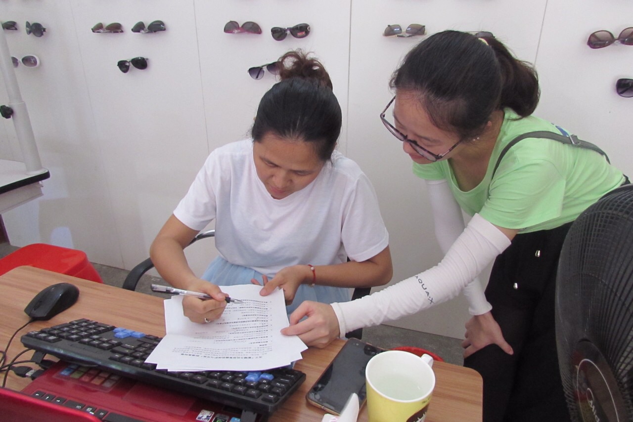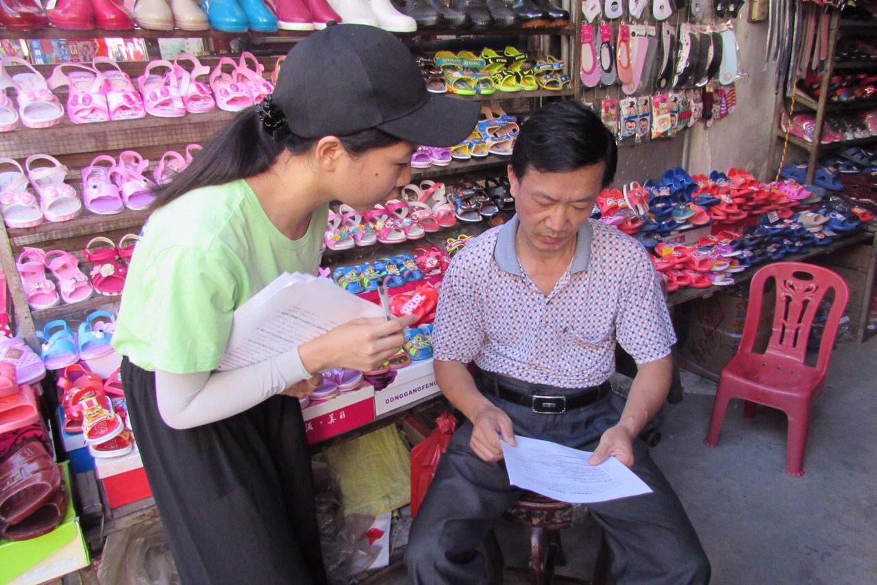 志愿者耐心向鞋铺老板讲解问卷内容