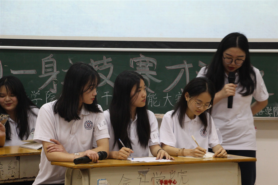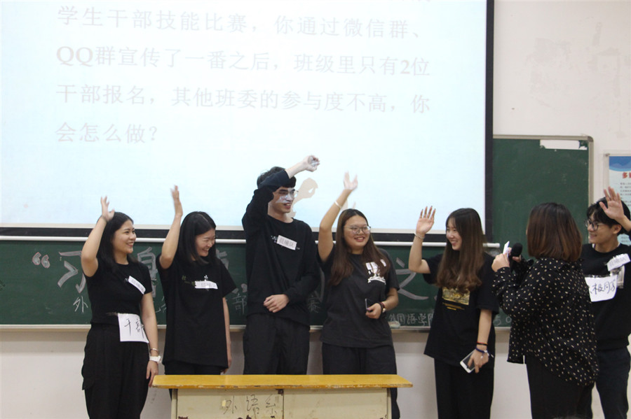 此次大赛遵循必赢官网学生干部培养思路,以“德智体美劳”五大模块为考核环节,赛制分为个人赛和团队赛,个人赛已于前期完成,现场为团体赛比拼。大赛伊始,各组队员根据特长,借助歌曲演唱、情景剧等载体展示了干部团队的风采。第二环节是知识竞答,意在考验干部们对时政热点及基本办公技能的掌握能力,各组选手集中精神,踊跃抢答,各组比分交替上升。信息概括与传达是学生干部必备技能之一,在第三环节里,现场所有干部一起参与其中,共同完成通知编辑与讲解。第四环节最具专业特色,以中英文诗歌互译形式考查选手们的专业水平,很好地活跃了赛场氛围。第五环节则围绕“班级学风建设”、“宿舍卫生检查”等日常工作内容开展情景模拟,选手们发挥才智与经验进行作答,展示了学生干部的应急管理能力和语言表达能力。