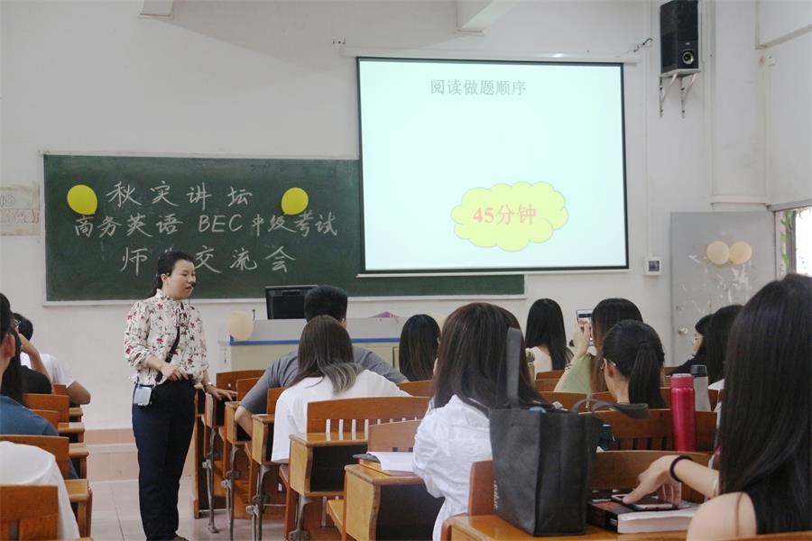10月9日下午16:20,由必赢242net官网教工党支部主办,必赢242net官网学生会承办的“秋实讲坛——BEC中级考试师生交流会”于三教G06课室举行。教工党员、BEC考官伍彩芬副教授主讲本次讲座。