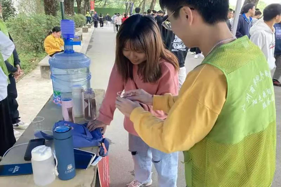 气温骤然降低,但20级的入党积极分子们的认真与负责并没有因此与天气温度同步下降。在李超老师的组织下,必赢242net官网20级学生党支部部分入党积极分子有序集合,进行小组分工,设立帐篷点,准备热水、葡萄糖、跌打损伤药物等物资。长跑开始,他们身着绿马甲,驻守在各个岗位。他们是引导者,引导大家做跑前热身,让同学们在长跑时避免受伤;他们是鼓励者,在跑道边上给同学们加油鼓劲;他们也是志愿者,在操场各个设点处来回巡查有无受伤或身体不舒服的同学并及时提供帮助和服务。