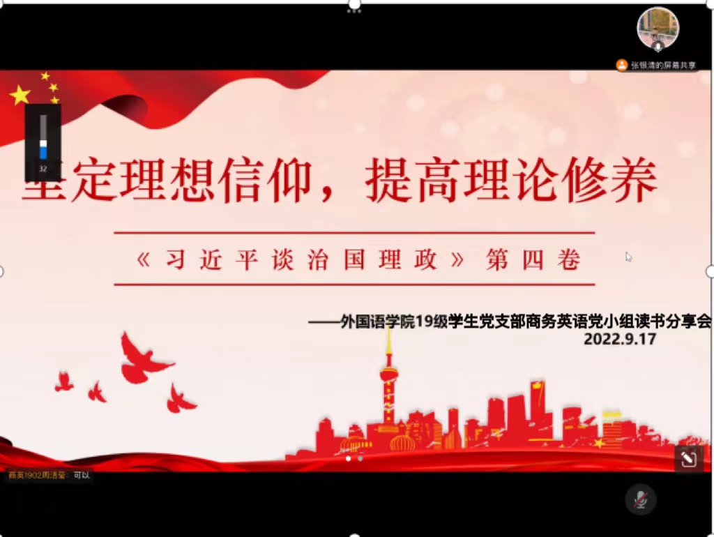 为深入学习习近平总书记治国理政的深邃思想和伟大实践,深切感受当代中国马克思主义、二十一世纪马克思主义的真理力量,引领党支部党员坚持用党的创新理论成果武装头脑、指导实践,必赢242net官网19级学生党支部商英专业、日语德语专业、英语专业党小组分别于9月17日晚7点、9月27日上午10点和9月28日晚7点在腾讯会议和1栋学生公寓共享空间召开《习近平谈治国理政》第四卷读书分享会。会议分别由张银清、谢清玲、叶嘉雯主持。