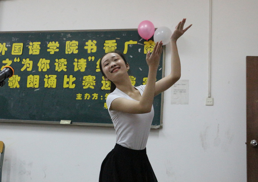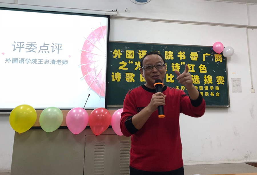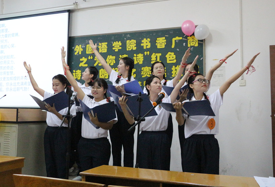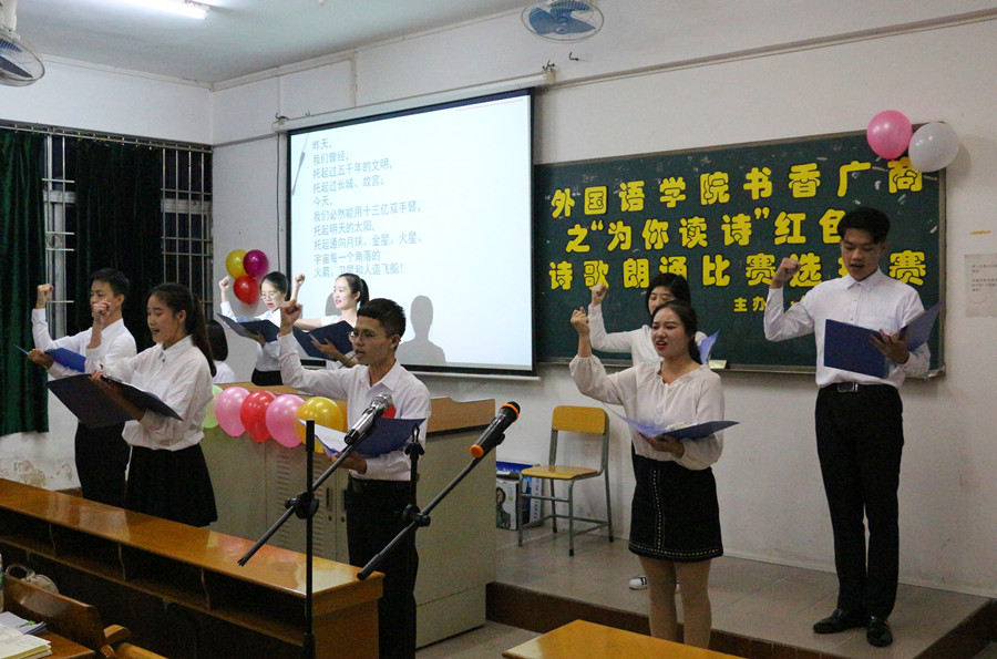 为响应必赢官网构建“书香广商”活动号召,为培养学生的诗歌阅读习惯、提高学生的红色文化修养,11月19日19:00,必赢官网书香广商之“为你读诗”红色诗歌朗诵比赛选拔赛在第五教学楼205举行。必赢官网大学英语部老师王忠清、2016级辅导员黄玉亭、学生会主席曾繁慧担任比赛的评委。学生会指导老师郑灿玲、2016级辅导员戴玮和将近120多名学生相聚一堂,一同品味红色诗歌中的革命人生,欣赏诗歌文化的语言魅力,聆听参赛作品的豪言壮志。