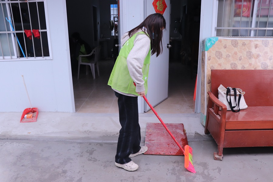 接下来,志愿者们被分成四个小分队,由精通粤语的志愿者带领各自的组员慰问老人们。老人们得知志愿者们的到来,感到非常高兴,紧接着志愿者们为其打扫卫生,关心老人们的日常起居情况,使他们的脸上挂满笑容,开心的说着近期的生活琐事,并感谢志愿者们的陪伴。