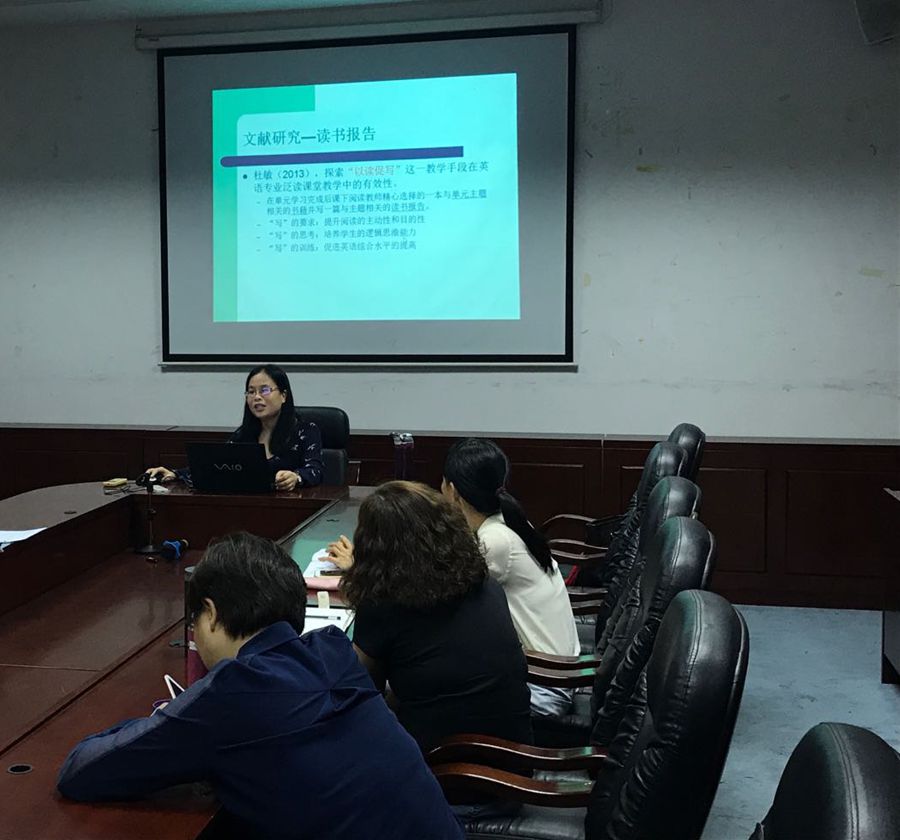 李老师指出英语专业低年级阅读教学存在学生阅读习惯差、阅读量小,教师考核与监督方式效率差、工作量大等问题,对于阅读课改革的相关文献进行的整理,她将与英语专业阅读教学相关的文献分为三大类:同伴协作、网络资料库和读书报告。李老师接着重点总结了她近几年上课采取的阅读报告的方法和:为学生提供阅读的指定书目与自选书目,阅读后进行口头报告,提交书面报告,作为平时成绩的重要组成部分。在过程中发现学生概括能力不足、框架意识不够,需要老师更加更进一步的指导。