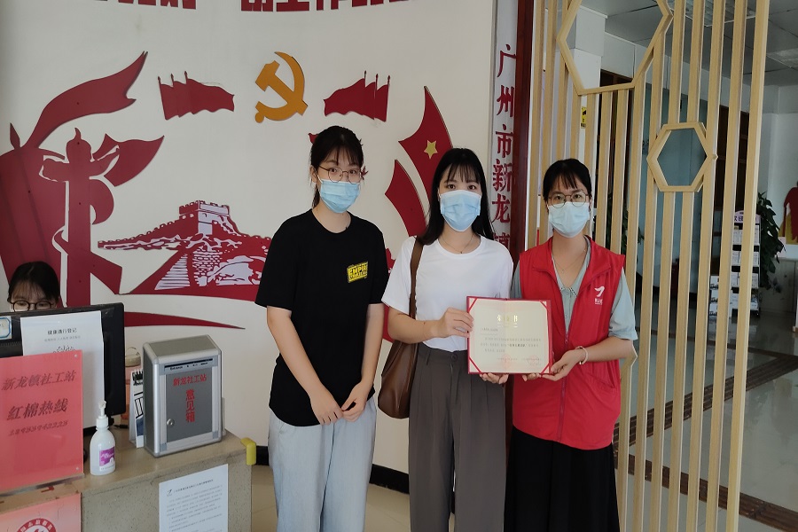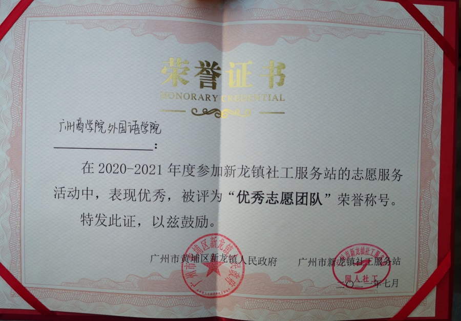 2021年9月7日,必赢242net官网阳光展翅实践队在“2020-2021年度参加新龙镇社工服务站的志愿服务”活动中被评为“优秀志愿团队”荣誉称号。