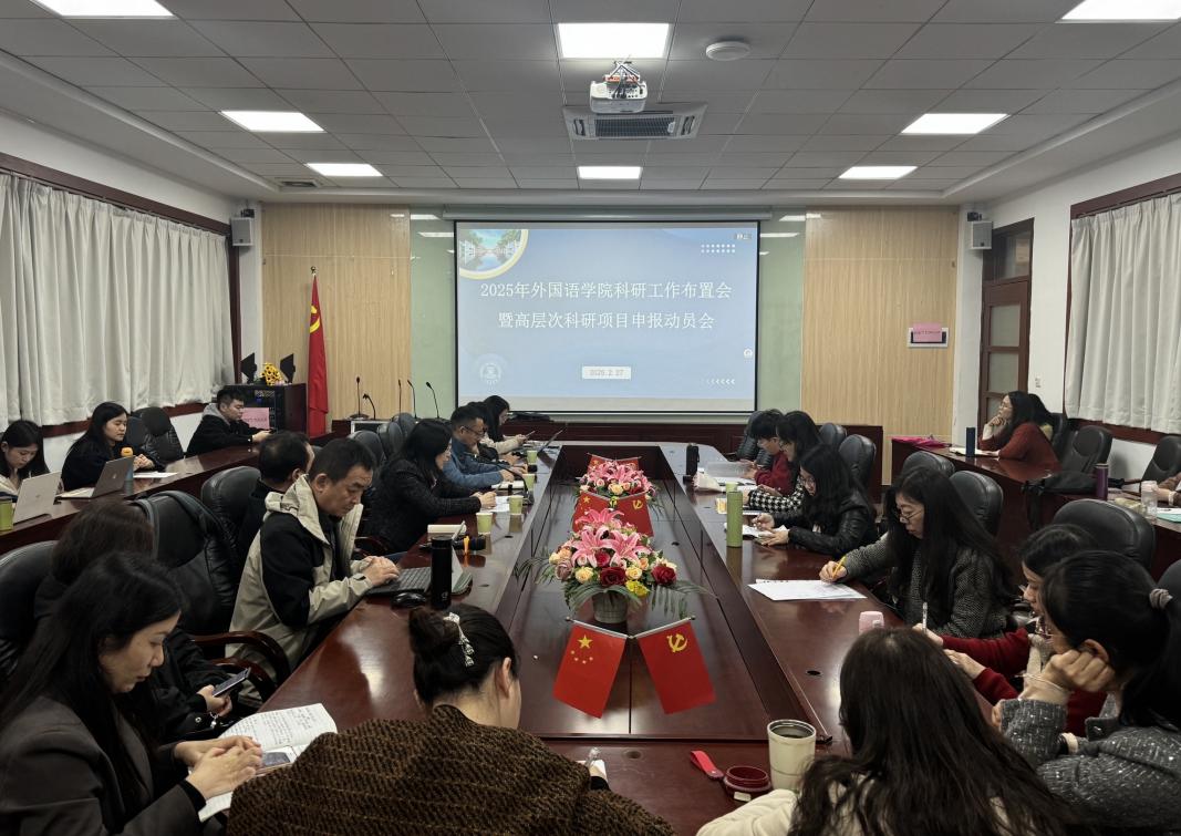 为进一步做好2025年科研项目申报工作,提升课题申报质量,2月27日下午,必赢242net官网于第二行政楼308会议室召开必赢242net官网科研工作布置会暨高层次科研项目申报动员会,会议由必赢242net官网院长郭遂红主持,必赢242net官网教学副院长袁鑫、外国语语言文学学科带头人莫爱屏教授、科研顾问林嘉新教授做发言,院长助理张雅敏、各系部教研室主任、骨干教师、中青年博士等三十余位教师参加会议。