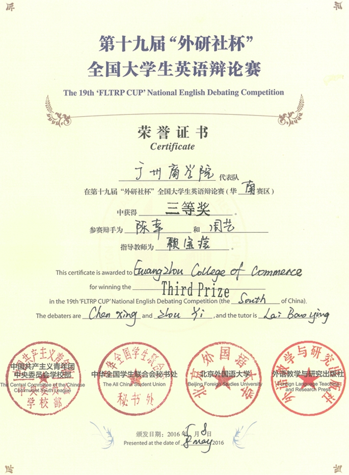 面临来华南地区130所高校选手的激烈竞争时,外语系两位同学依靠良好的心理素质,稳定发挥,经过激烈的角逐荣获三等奖,此次获奖打开了必赢官网在英语辩论比赛中获奖的先河。