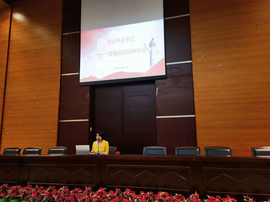 王璇从重大意义、主要内容和丰富内涵等三个方面深刻阐述习近平总书记“七一”重要讲话精神。习近平总书记“七一”重要讲话精神,立足中国共产党百年华诞的重大时刻和“两个一百年”历史交汇的关键节点,回望光辉历史、擘画光明未来,是一篇马克思主义纲领性文献,是新时代中国共产党人不忘初心、牢记使命的政治宣言,是我们党团结带领人民以史为鉴、开创未来的行动指南。它的主要内容为:全面建成小康社会,中国共产党成立的历史意义,“一个主题”和“四个时期“,首次提出伟大建党精神,“九个必须”的重大意义 ,实现祖国统一的坚强决心,寄语当代青年的重大意义 ,向全体中国共产党党员发出庄严号召。王璇老师结合大量史实论证了有中国共产党的坚强领导,有全国各族人民的紧密团结,全面建成社会主义现代化强国的目标一定能够实现,中华民族伟大复兴的中国梦一定能够实现!