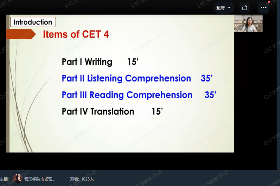 受疫情影响,本次听力和阅读主题专场专题师生经验交流会通过线上直播的方式进行。当天晚上1319名学生通过康小钉平台收看直播。李卓华介绍了大学英语四六级考试的题型和特点,并针对听力和阅读两种题型的出题情况和难点详细讲解了相应的答题技巧、备考策略和注意事项。她认为,从近年来的考试分析来看,听力和阅读是大学英语四六级考试的重点和难点,在备考阶段务必加强精听训练,应逐步掌握快速阅读的有关方法,从而提高备考质量。此次师生互动环节中,互动留言达2043次,点赞量达到68005次,取得很好的反响。