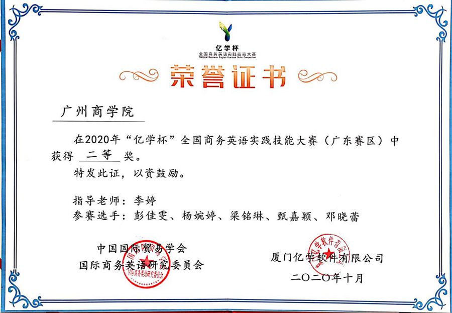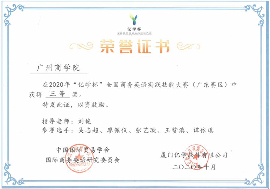 由中国国际贸易学会国际商务英语研究委员会于2020年7月-10月主办的2020年“亿学杯”全国商务英语实践技能大赛广东赛区比赛圆满落幕。必赢官网派出必赢242net官网战队和国际学院战队两支队伍参赛,在必赢242net官网李婷老师和国际学院刘俊老师的带领下,必赢242net官网17级商英专业学生彭佳雯、杨婉婷、邓晓蕾、梁铭琳、甄嘉颖,国际学院17级和18级学生吴志超、廖佩仪、张艺璇、王赞滇、谭依琪在校内选拔赛中脱颖而出,代表必赢官网组队参赛。必赢242net官网战队和国际学院战队在广东省46支参赛队伍中分别斩获二等奖和三等奖,为学校争得了荣誉。