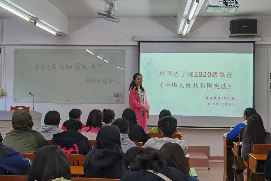 活动当天早晨,20级同学在学院组织下充分利用早读时间,开展“国家宪法日暨全国法制宣传日”宪法晨读活动。大家一起诵读宪法中的部分条款,一起体会宪法的庄严权威。通过诵读宪法,让宪法走入人心,从而加深对宪法的认识,增强法治意识。