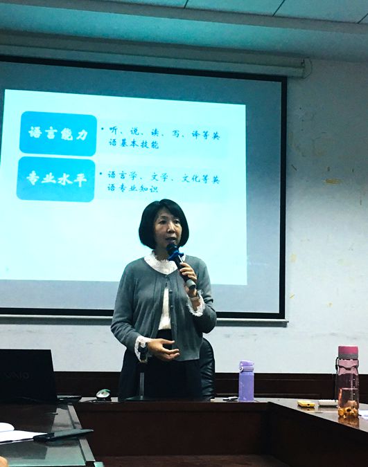 刘岩教授首先分享了国内最新的外国语言文学学科建设指导思路的变化,指出如今外国语言文学的学科建设不在以语种为界限,而是以五个研究方向为分类标准。接着她就“大学英语教育面临社会办学巨大冲击”这一问题提出了自己的见解,她认为大学英语教育应该坚持素质教育,以培养人才为中心,不仅注重提高学生的语言能力,更要致力于提高学生专业理论水平和综合素质。刘岩教授随后通过两则课堂案例分析,生动地阐释了如何在教学中通过“拓展”帮助学生积累英语语言文化知识,如何在“文化研究模型”的指导下开展文化文本的教学与研究。最后刘岩教授为教师发展提出了三点建议,并鼓励大家教学科研两手抓,注重长期的积累和不懈的坚持。