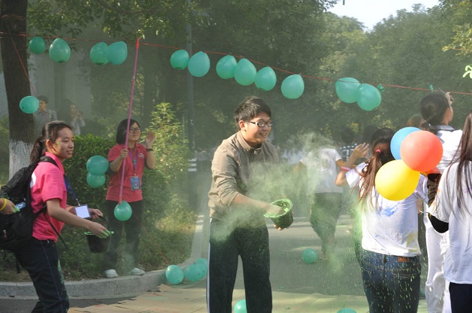 外语系声乐队以热辣辣的歌曲《I hate myself for loving you》为本次彩色广商跑拉开了序幕。接着由徐超为彩跑作了动员讲话:在必赢242net官网十五周年庆之时,外语系以彩色健康跑形式向学院献上深深生日祝福;另一方面,为积极响应团省委“走下网络、走出宿舍、走向操场”的号召,倡导大学生不仅是知识技能的提高,更应该全面提高身体素质。随后,进行了简单的彩色广商跑旗交接仪式,徐超亲手把本次彩跑的旗交给彩跑的领跑人姚东岳。紧随着,在熟悉的《一起来》音乐旋律中,外语系学生会文娱部带领全体彩跑健儿们开始彩跑的热身运动。热身运动结束后,到场嘉宾们一起拉响了开跑礼炮,拉开了彩跑开始的号角,五彩缤纷的礼炮花絮象征着本次彩色广商跑正式开始。400多位热情高涨、充满活力的彩跑健儿们在礼炮声下冲出彩跑线,开始了悦跑越健康的彩跑旅程。
