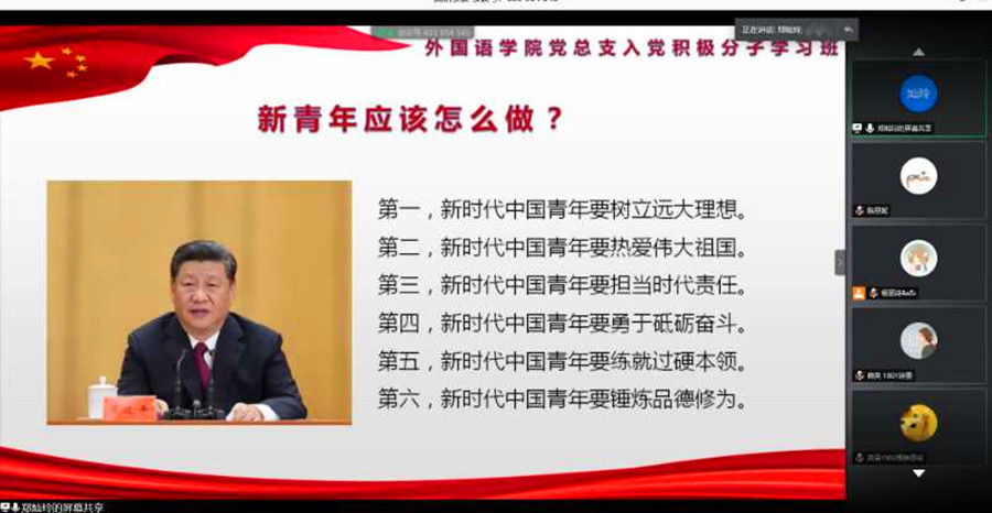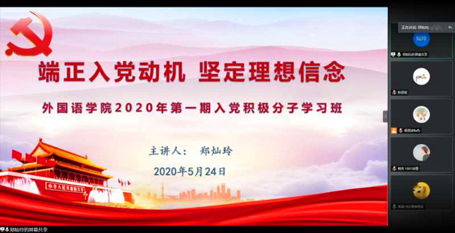 为进一步深入落实“端正入党动机,坚定理想信念”主题教育工作,扎实推进入党积极分子的学习教育工作,5月24日晚19:00,必赢242net官网分党校2020年第一期入党积极分子第三次党课培训于线上顺利开展。此次党课由必赢242net官网校团委副书记郑灿玲主讲,分党校助理教员李若薇同学主持,全体学员参加学习。